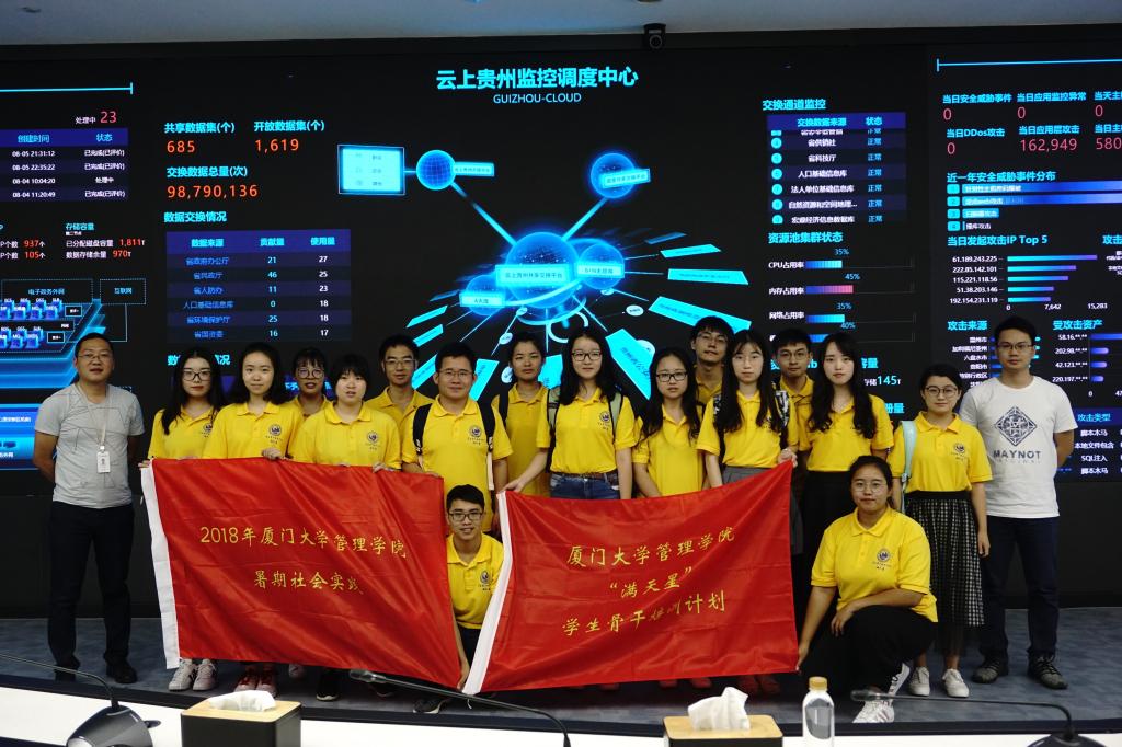 为深入贯彻落实习近平新时代中国特色社会主义思想和党的十九大精神,深入推进“不忘初心、牢记使命”主题教育,充分展现“双一流”高校学子服务地方经济发展的突出优势,7月29日至8月6日,厦门大学“学习之路”实践团“筑梦云端”实践队在管理学院辅导员邵亢邑、刘晓宇的带领下,学习习近平总书记对于国家创新战略的重要指示精神,远赴贵州开展大数据产业发展以及理想信念教育的专题调研实践活动。