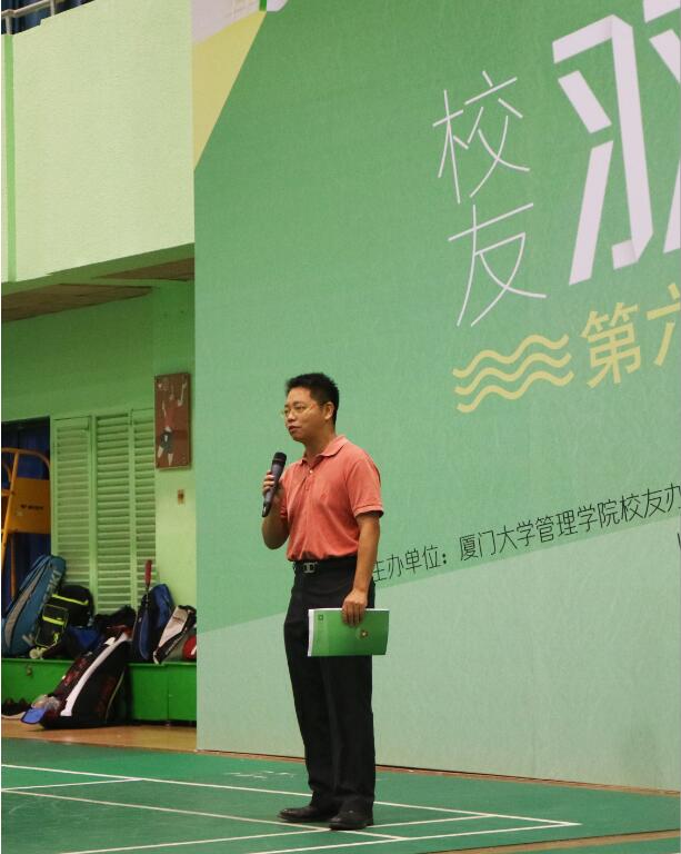 在主持人的引导下,第六届厦门大学管理学院校友羽毛球赛缓缓拉开序幕,首先进行开幕式,这次参与羽毛球赛的有八支队伍,分别是企管系球队、MBA球队、EMBA嘉庚队、EMBA群贤队、EDP球队、MPAcc球队、ME球队、MTA球队,在经过流程和赛制的介绍后,主持人邀请了管理学院副院长于李胜教授上台致辞并进行了开球仪式,秉着“联系厦大学子,弘扬嘉庚精神,传承商学文化,助力校友成长”的工作宗旨,于副院长在喝彩声中击出了漂亮的一球。随后全体人员合影留念,比赛即将开始。