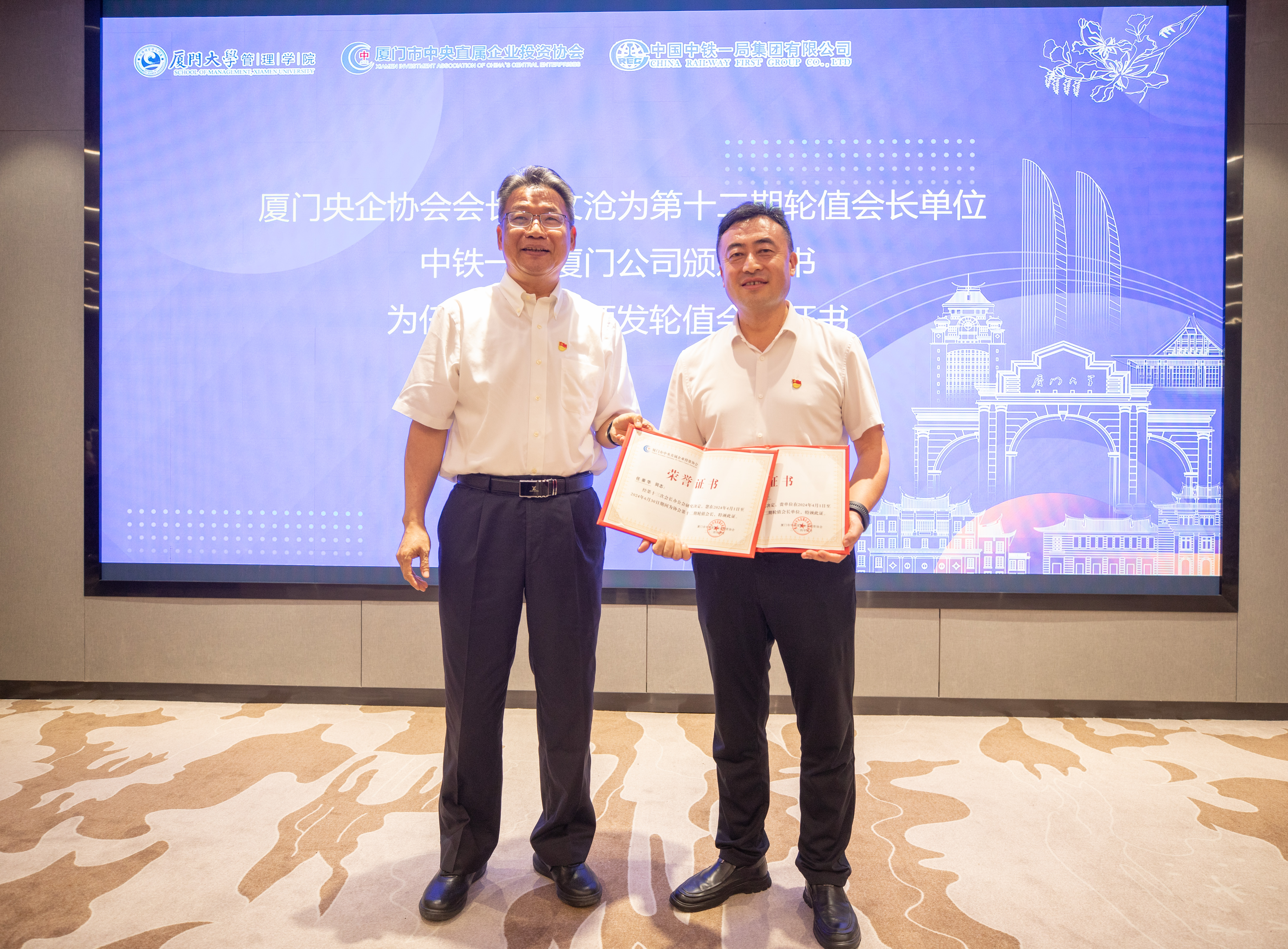 谢文沧为厦门央企协会第十二期轮值会长单位中铁一局厦门公司颁发证书,并为任崇华颁发轮值会长证书。