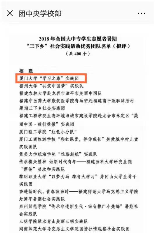 近日,团中央学校部、全国学联秘书处联合公布了在2018年全国大中专学生志愿者暑期“三下乡”社会实践活动中表现突出的集体和个人名单。经基层申报、省级团委审核推荐、专家评审等环节,由共青团厦门大学委员会、厦门大学管理学院共同组织的“学习之路”实践团以专业的课题成果、丰富的实践内容,获得全国“三下乡”社会实践活动优秀团队称号。