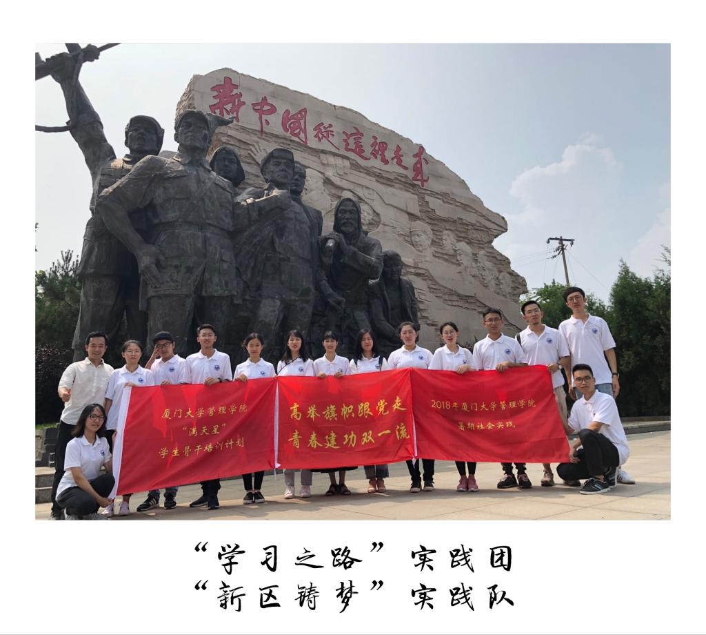 “学习之路”实践团是在共青团厦门大学委员会和管理学院党委的共同指导下,为深入贯彻落实习近平新时代中国特色社会主义思想和党的十九大精神,深入推进“不忘初心、牢记使命”主题教育实践活动,充分展现“双一流”高校学子服务地方经济发展的突出优势而组建的一支社会实践队伍。7月29日至8月6日,“学习之路”实践团在管理学院党委副书记戴蓥,团委副书记吴荣梅,辅导员揭上锋、邵亢邑、刘晓宇的带领下,分赴贵州、河北、陕西三地,学习习近平总书记对于国家创新战略的重要指示精神和“五四”青年节讲话精神,探寻新思想的发源地,开展专题社会实践活动。