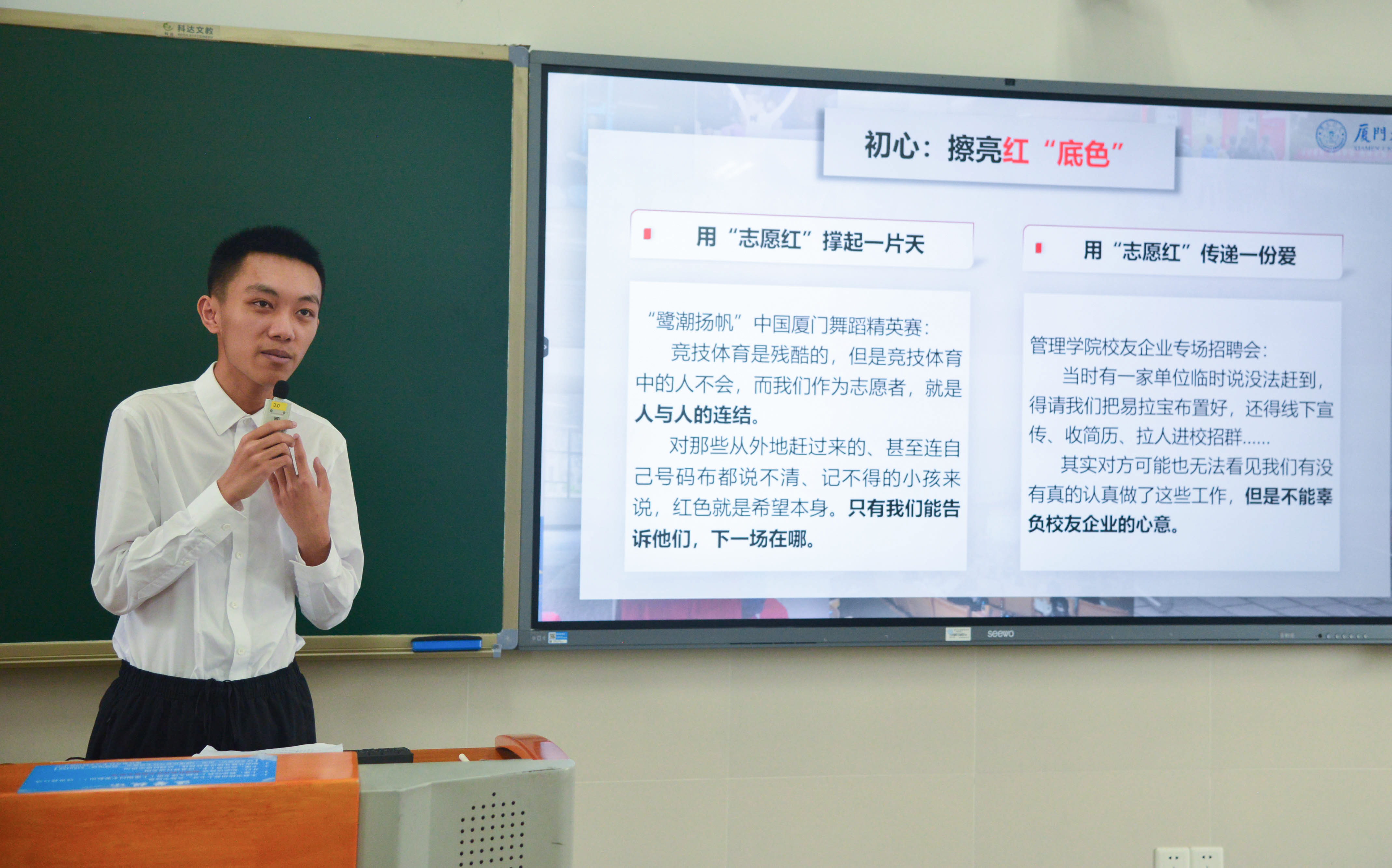 “青年志愿服务之星”获奖代表李亦琦、程允中、王紫瑞依次进行志愿服务风采展示。李亦琦同学娓娓道来她与黄厝社区的“缘起、缘定、缘聚、结缘”四部曲,分享深入基层社区开展志愿服务的深刻感悟与体会;程允中同学讲述了参与大型赛会志愿服务的经历,在服务中,擦亮担当奉献的“底色”、保持友爱互助的“本色”、提升团结进步的“成色”;王紫瑞同学回顾了在图书馆与学习共享空间的志愿服务经历,她将志愿服务与学校学风建设要求相结合,号召更多同学通过志愿服务带动大家勤勉努力、潜心学术,共同营造严谨认真、积极向上的良好学风。