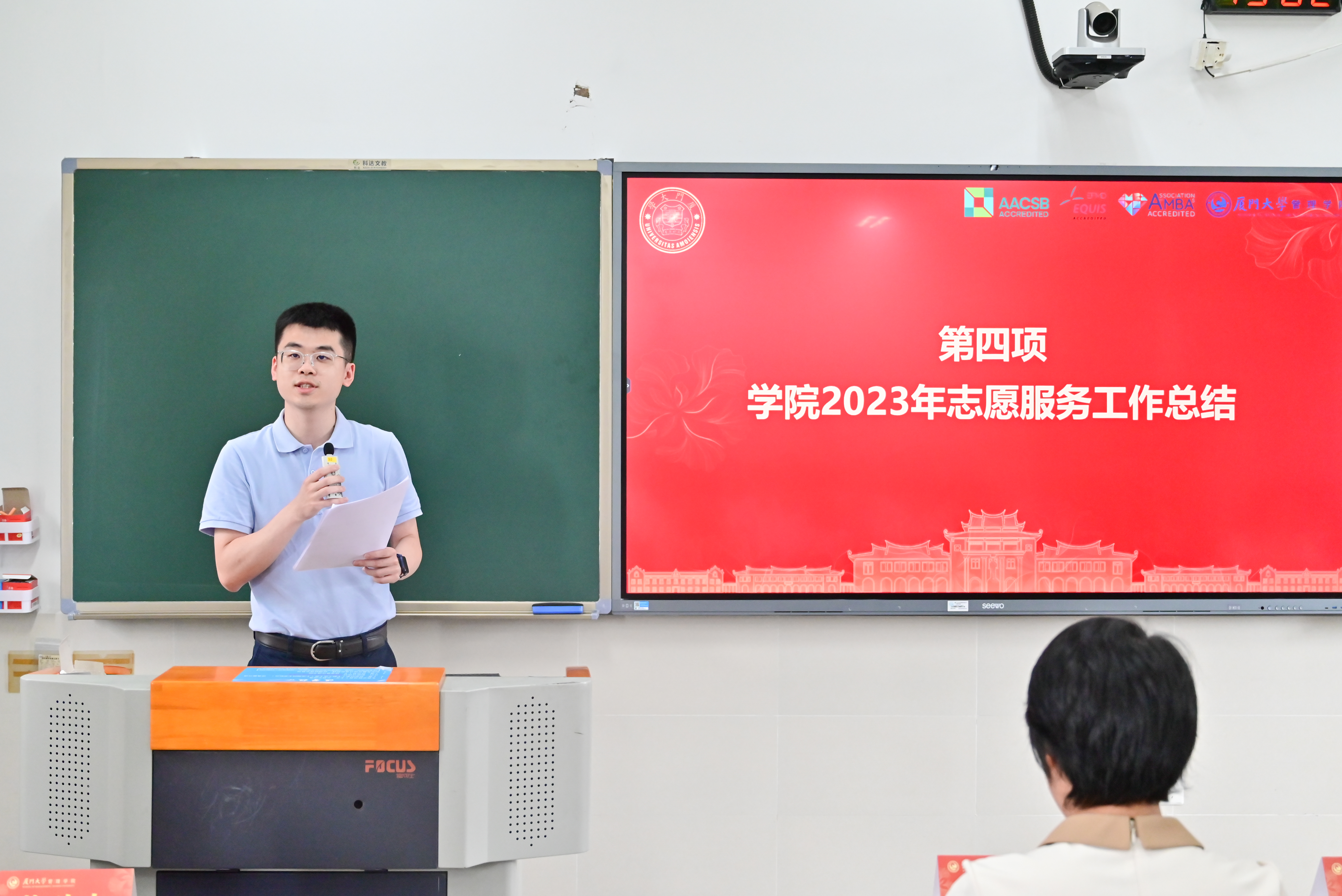 黄劲夫就2023年度管理学院志愿服务体系建设与项目成果作总体介绍,展示了过去一年青年志愿者协会致力于打造志愿服务项目品牌,扎实推进志愿服务制度化所开展的积极有效探索,并对下一阶段的工作作了初步计划与展望。