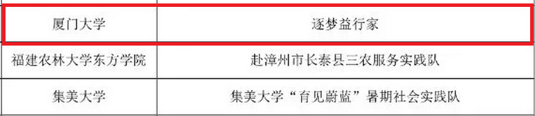 2018年11月16日,团中央学校部、中国青年报社、人民网联合公布了2018年全国大中专学生志愿者暑期“三下乡”社会实践“千校千项”成果遴选活动中表现突出的集体和个人名单。管理学院唐炎钊教授、研究生辅导员揭上锋指导,能源与政策研究院硕士研究生白锐同学担任队长的“逐梦益行家”实践队以丰富的实践内容、突出的课题成果,获得全国“三下乡”社会实践活动 “匠心传播好作品”荣誉称号,是厦门大学4支入选“千校千项”表彰的团队之一,也是厦门大学唯一获得“千校千项”之“匠心传播好作品”实践队。