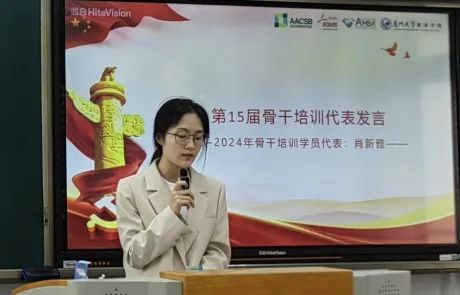第三小组成员、2023级会计学研究生肖新雅作为本次干训小组学员代表发言。她认为,作为管理学院的一份子,同学们承载着学院的期望,肩负着提升自我、服务同学、推动学院发展的重任。她期待本届干训班的学员们不仅能够提升个人能力,更能在相互学习中激发集体的智慧、形成团队合力,为学院的建设和发展贡献力量。