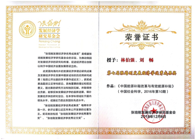 2018年12月8日,第七届张培刚发展经济学优秀成果奖、第一届张培刚发展经济学青年学者奖颁奖典礼在华中科技大学经济学院隆重举行。厦门大学管理学院“长江学者”特聘教授、中国能源政策研究院院长、《Energy Economics》共同主编林伯强(第一作者,通讯作者),与西南财经大学工商工商管理学院产业经济研究所讲师刘畅(林伯强教授博士研究生)合作发表在《中国社会科学》(2016年第10期)的论文“中国能源补贴改革与有效能源补贴”荣获第七届“张培刚发展经济学优秀成果奖”。