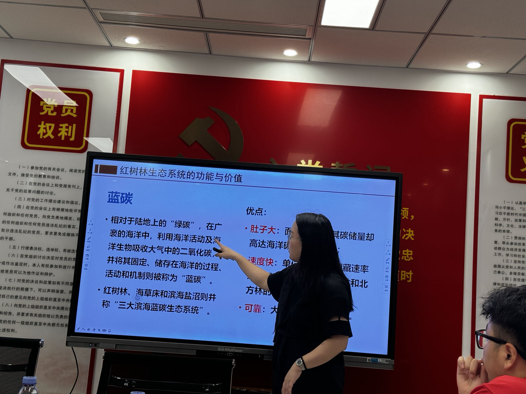 刘莉颖介绍了红树林党支部聚合“学校—学院—台站—师生—公众”多元主体创新基层党支部设置,充分发挥基层党组织的政治优势和组织优势,通过密切联系师生开展教学科研,大力弘扬“迎风破浪、勇于创新”的红树林精神。