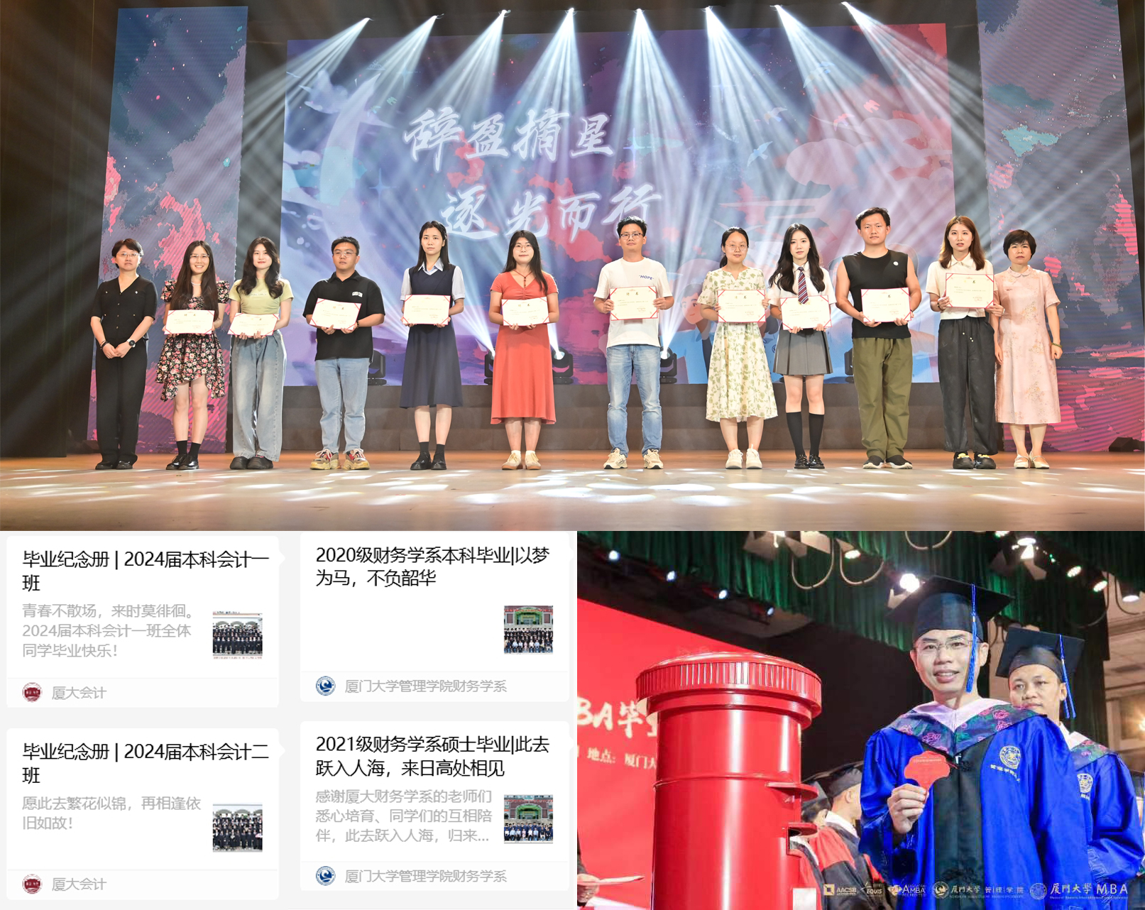 学院举行敦聘年级联络员仪式,增强他们的使命感和责任感,维系全体毕业生和学院的密切联络。各系、中心、研究院也结合学科特色,为毕业生准备专属纪念。例如,会计学系设置“人才专列”合影打卡点,推出各班电子版“毕业纪念册”;财务学系发布毕业生纪念视频和留言板;MBA中心举行毕业典礼,邀请杰出校友或业界领袖传递人生经验和职场智慧,“凤凰花之约”卡片投递等特色活动纪念学子们的精彩求学时光等等。一场场仪式典礼、分享交流,将服务育人与朋辈引领有机结合,教育毕业生满怀热情投身工作岗位,在新征程上书写厦大学子新的报国故事。