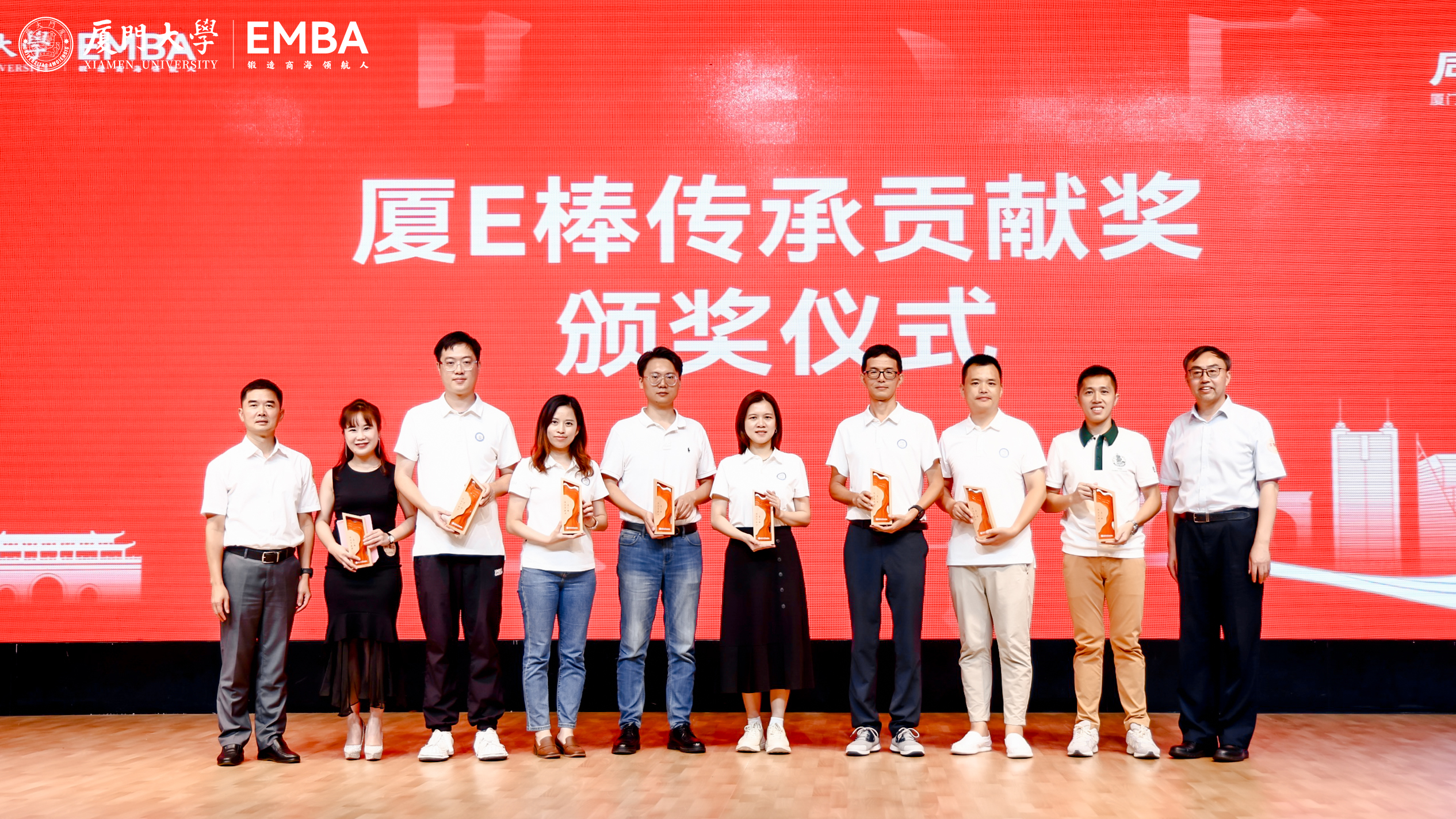 晚宴现场,张明智、李常青为部分老生颁发“厦E棒传承贡献奖”,感谢他们对母校的支持。