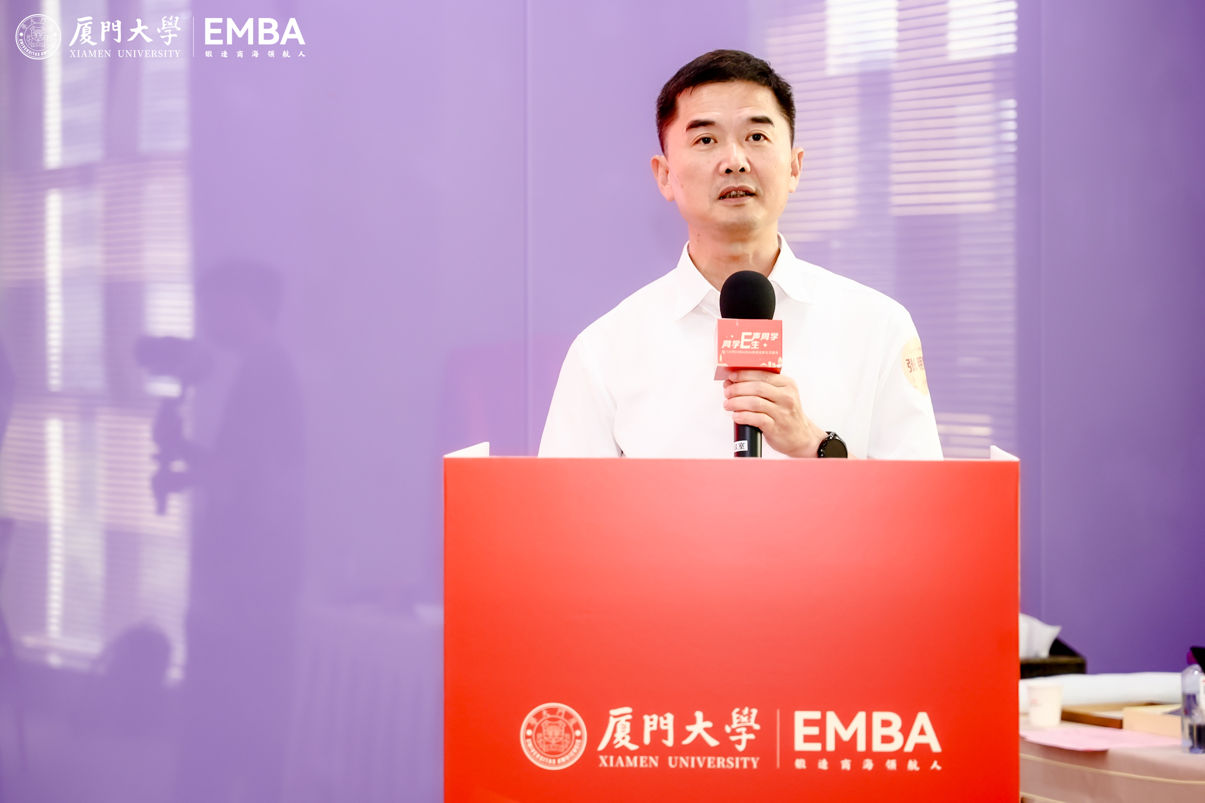 厦门大学EMBA2023级思源班同学、广东粤金所控股集团有限公司金融事业部总经理陈乾森和厦门大学EMBA2023级思源班同学、广东广达电器行政副总监阮嘉欣为新生们分享他们和厦E之间的故事。