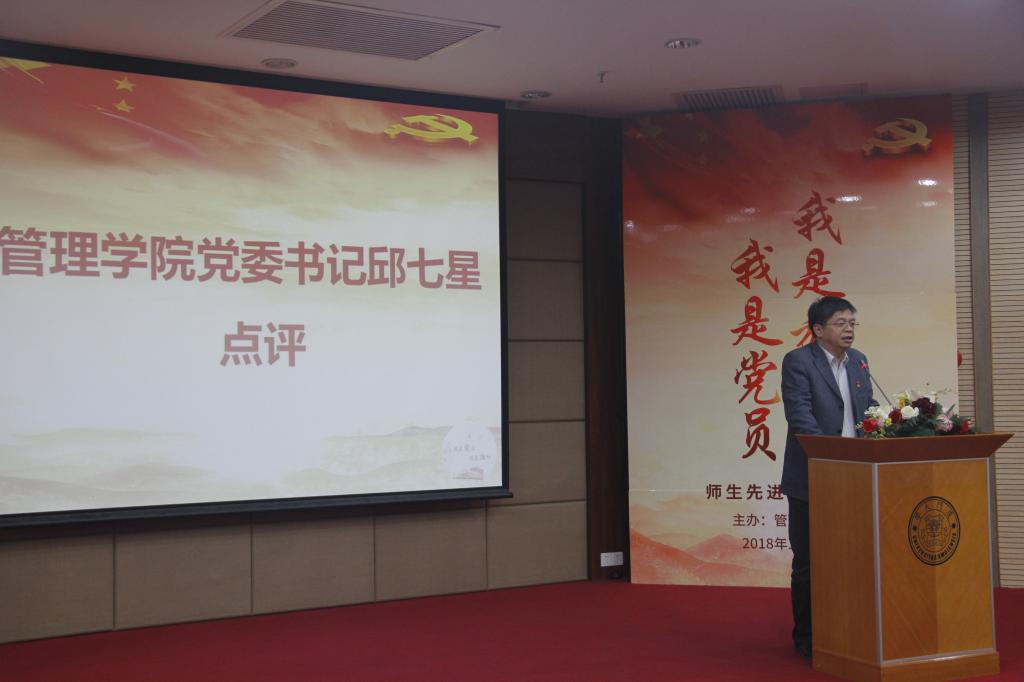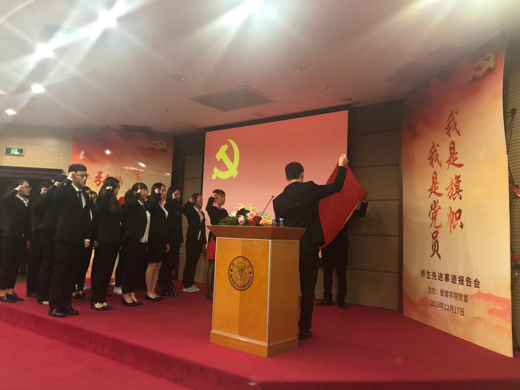 “无论在什么时刻,在什么地点,在什么岗位,都要将‘我是党员’牢记于心,都要将‘我是旗帜’发扬出来。”管理学院党委书记邱七星在总结讲话中寄语全体师生。在报告会现场,还举行了2018年学生新党员入党宣誓仪式,“我志愿加入中国共产党”的誓言鼓舞了师生党员矢志奋斗、建功立业的决心。活动结束后,师生纷纷有感而发,管理科学系2017级硕士生党支部书记史维娜如此感言:“作为青年党员,要把爱国之情、强国之志、报国之行统一起来,肩负时代使命,答好时代考卷。”