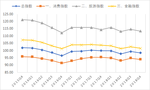 2018年第四季度海西地区金融、旅游、消费信心总指数为98.50点,环比下降0.92点,同比下降1.48点。其中消费指数93.99点,环比下降0.80点,同比下降1.45点;旅游指数113.45点,环比下降1.23点,同比下降0.90点;金融指数101.55点,环比下降1.15点,同比下降2.23点。