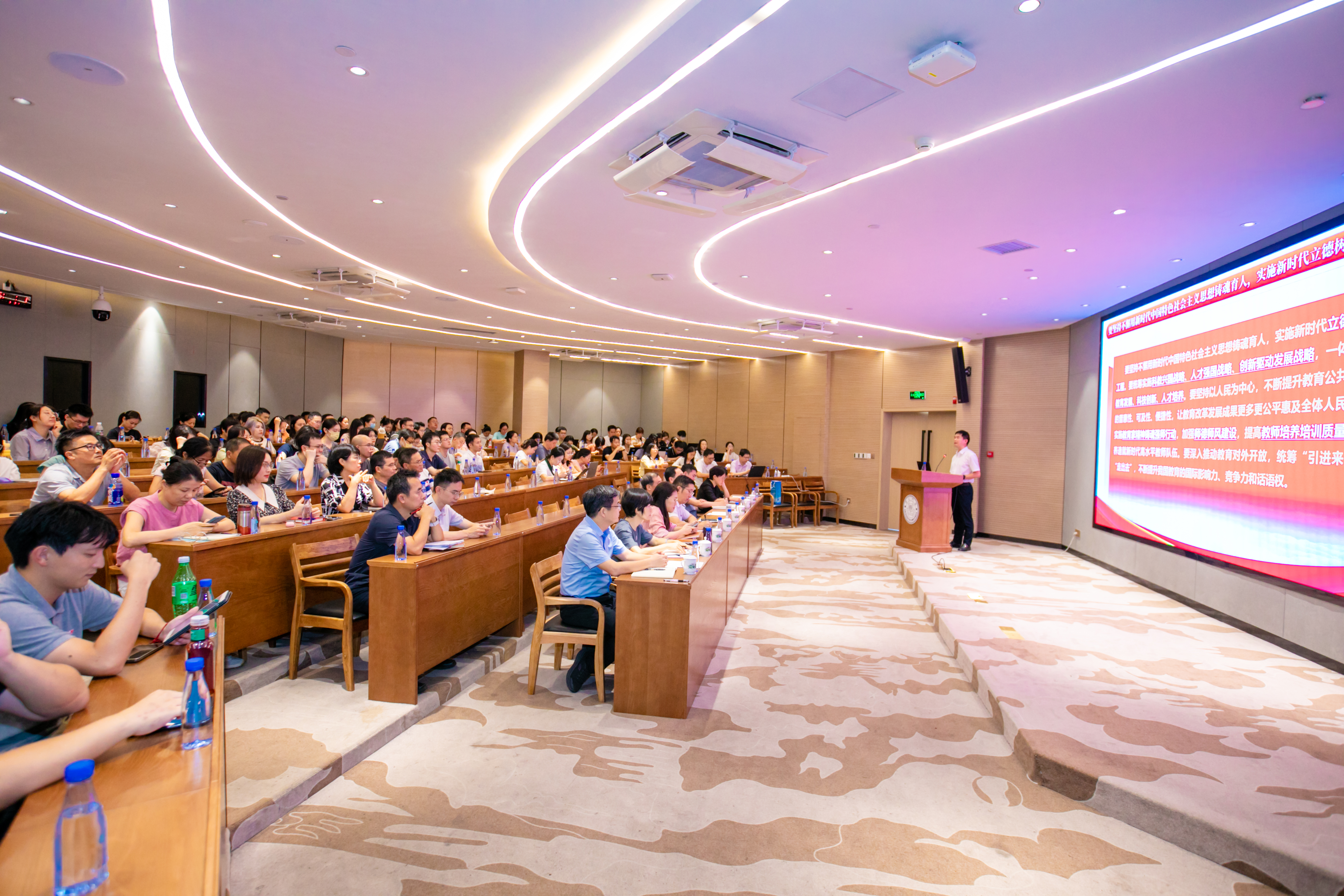 蔡宁结合分管领域提出新学年三大工作重点。在推进高质量本科教材建设方面,强调组织申报“十四五”规划教材注意事项,明确开展数字化教材建设改进方向;在推进本科教育教学改革方面,讲解“大数据+”双学位项目建设计划,提出加强国家级一流本科专业建设;在推动高质量国际化工作方面,表示将全力迎接学科认证工作、推动人才培养国际化。