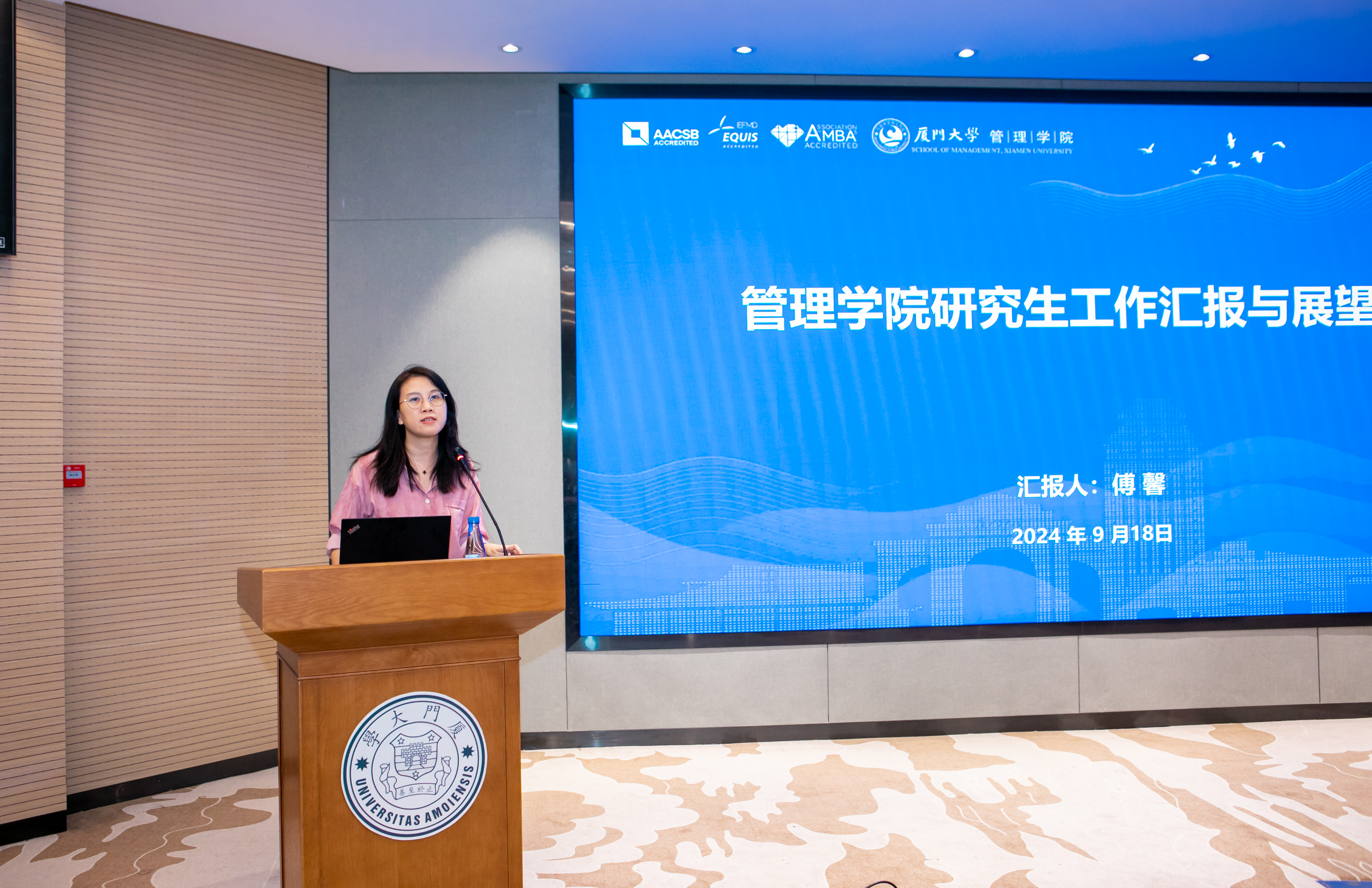 傅馨全面梳理了研究生培养的整体情况,列举招生选拔、学位论文质量保障、教学科研支撑等要点;聚焦学科评估、学位点评估总结成效。她立足教学支撑、人才培养、学科发展三个角度分析问题,抓住课程体系优化升级、培养质量提升工程两大重点,明确完善培养方案、“人工智能+商科”课程体系构建等举措,希望进一步提升培养质量和学生满意度。