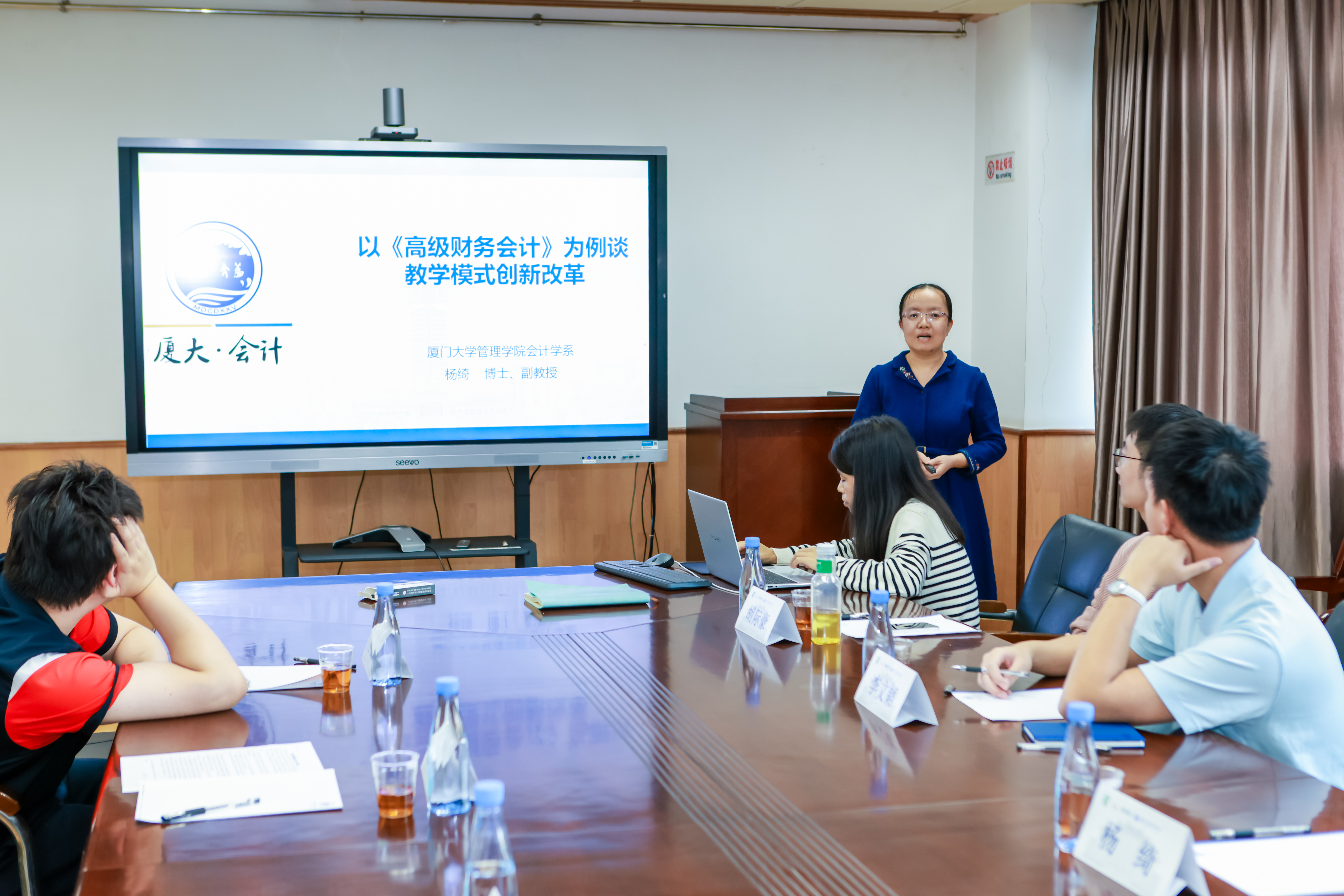 杨绮副教授作教学经验分享讲座。杨绮结合自身多年的教学实践经验,从《高级财务会计》的教学改革实践历程入手,以课程设计、课堂管理、教学方法创新等多个维度开展细致入微的分享。杨绮以平易近人的语言和贴合实际的案例,阐述了如何打造翻转课堂、如何与学生进行良性互动、如何进行混合式教学模式的创新改革,让新进教师们深受启发,对即将开启的教学工作有更清晰的思路和更充足的信心。