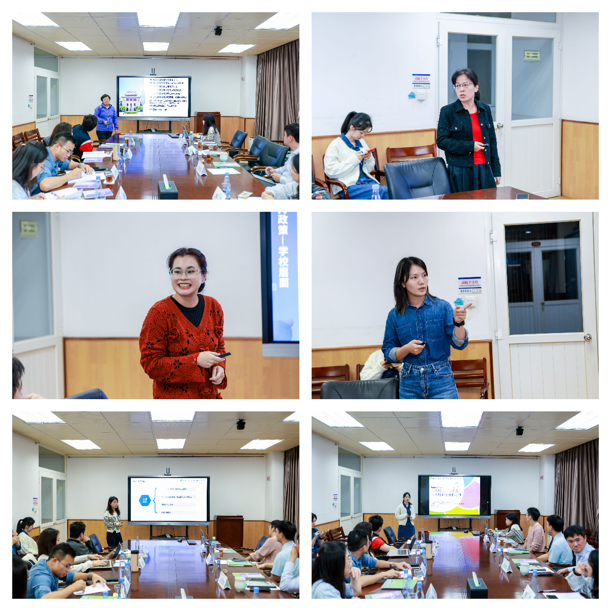 学院部分行政部门秘书为新教师作政策介绍。本科教学办公室秘书石云从多方面讲解本科教学政策,涵盖课堂教学规范、教学事故处理、教材选用、课程考核等。研究生教学办公室秘书夏艳辉介绍了研究生导师招生资格、招生政策、课程教学管理及招生培养管理等内容。科研秘书吴琼就科研项目申报、经费使用、奖项申报等方面介绍新教师关心的科研问题。人事秘书翁苏伟、陈婧先后从聘任考核、人才项目等方面解释人事政策。外事秘书陈婉莉重点从“走出去”方面解读学院教师板块外事概述、外事政策及申报实务。