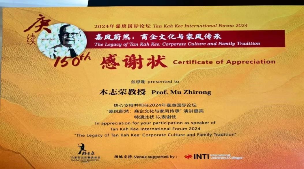 2024年12月7日,厦门大学管理学院教授木志荣应邀出席在马来西亚英迪梳邦国际学院礼堂举办的“2024年嘉庚国际论坛”。此次论坛由马来西亚陈嘉庚基金会主办,以“嘉风蔚然:商企文化与家风传承”为主题,旨在深入探讨陈嘉庚先生的商业哲学和家风传承的重要性。
