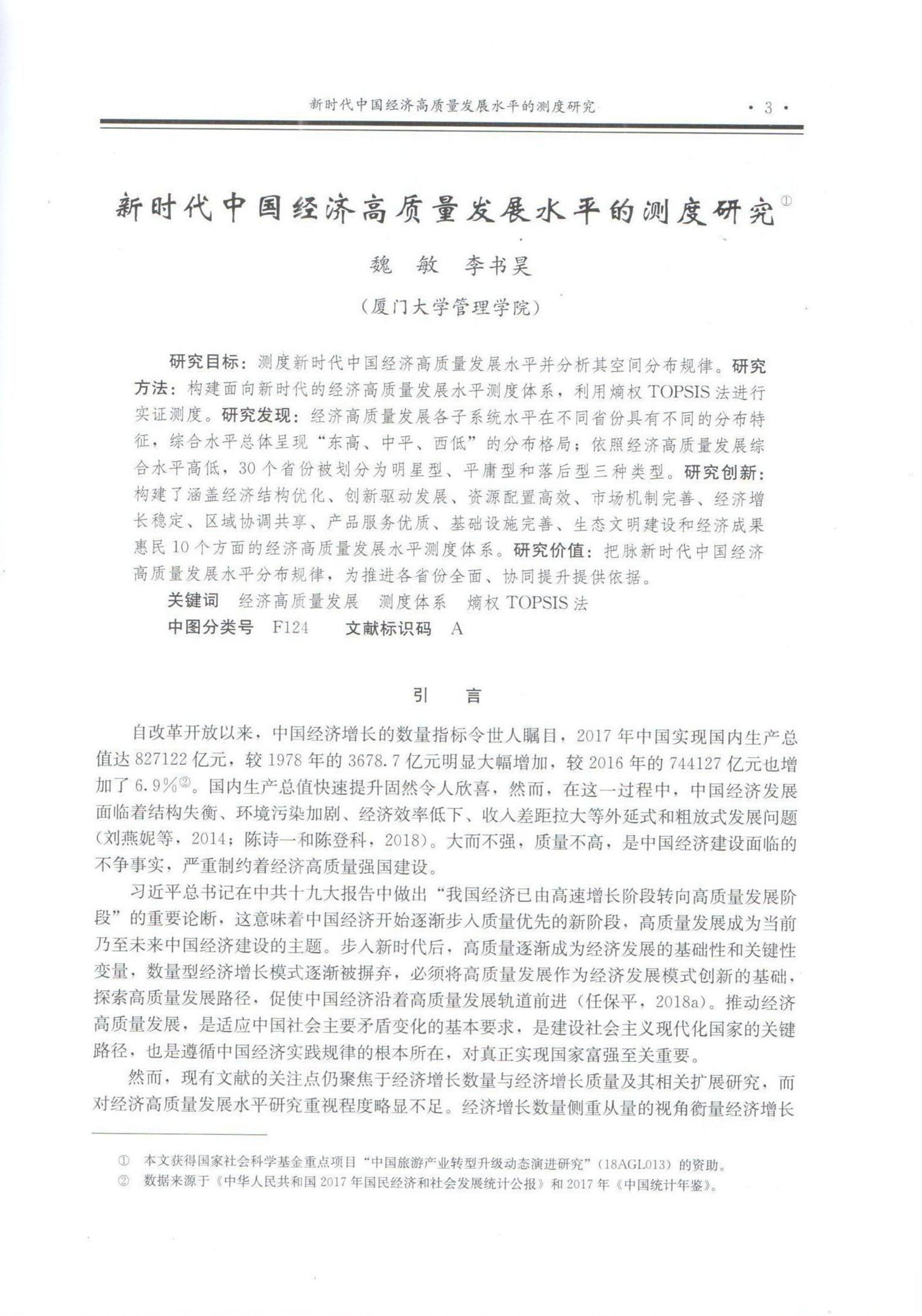 管理学院旅游与酒店管理系2018级博士研究生李书昊与其导师魏敏教授合作撰写的论文“新时代中国经济高质量发展水平的测度研究”在《数量经济技术经济研究》2018年第11期正式刊出。