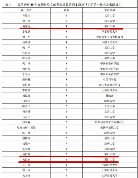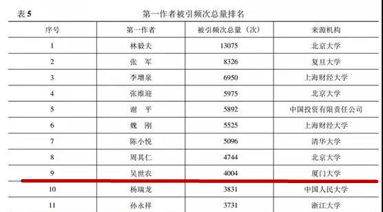 管理学院葛家澍教授以4篇的总量位列改革开放40年高频被引文献的第一作者的第三位,管理学院吴世农教授、林伯强教授都以2篇的总量进入榜单。在第一作者被引频次方面,吴世农教授以4004次的被引总量位列第9位。