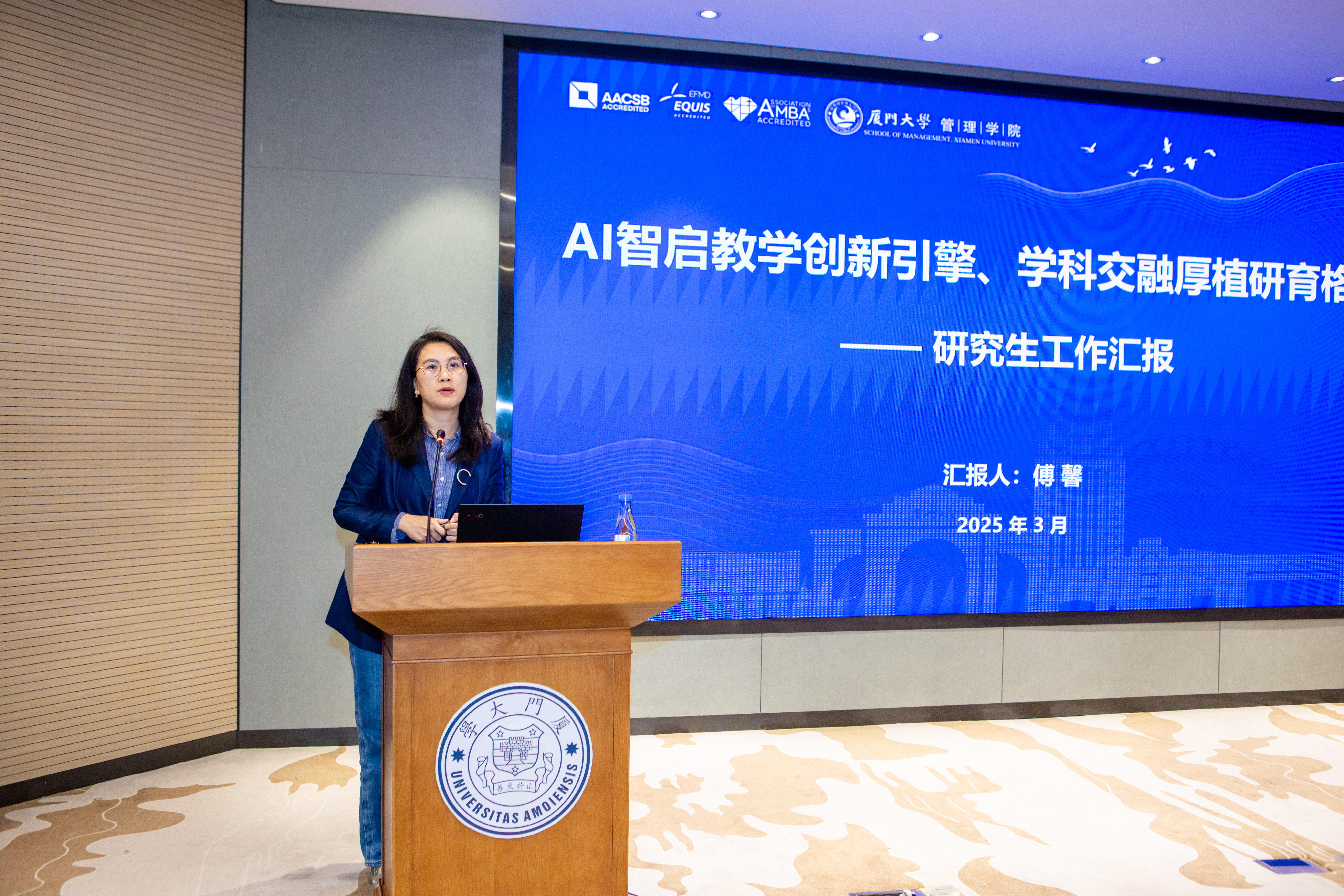 傅馨对学院研究生工作进行部署,从学生“招-培-就”的培养流程展开阐述,展示培养成效——获学校研究生目标责任制考核获示范奖。分析研究生培养现状、政策变化、挑战等,提出提升博士研究生培养质量、优化AI赋能商科课程体系等一系列举措。