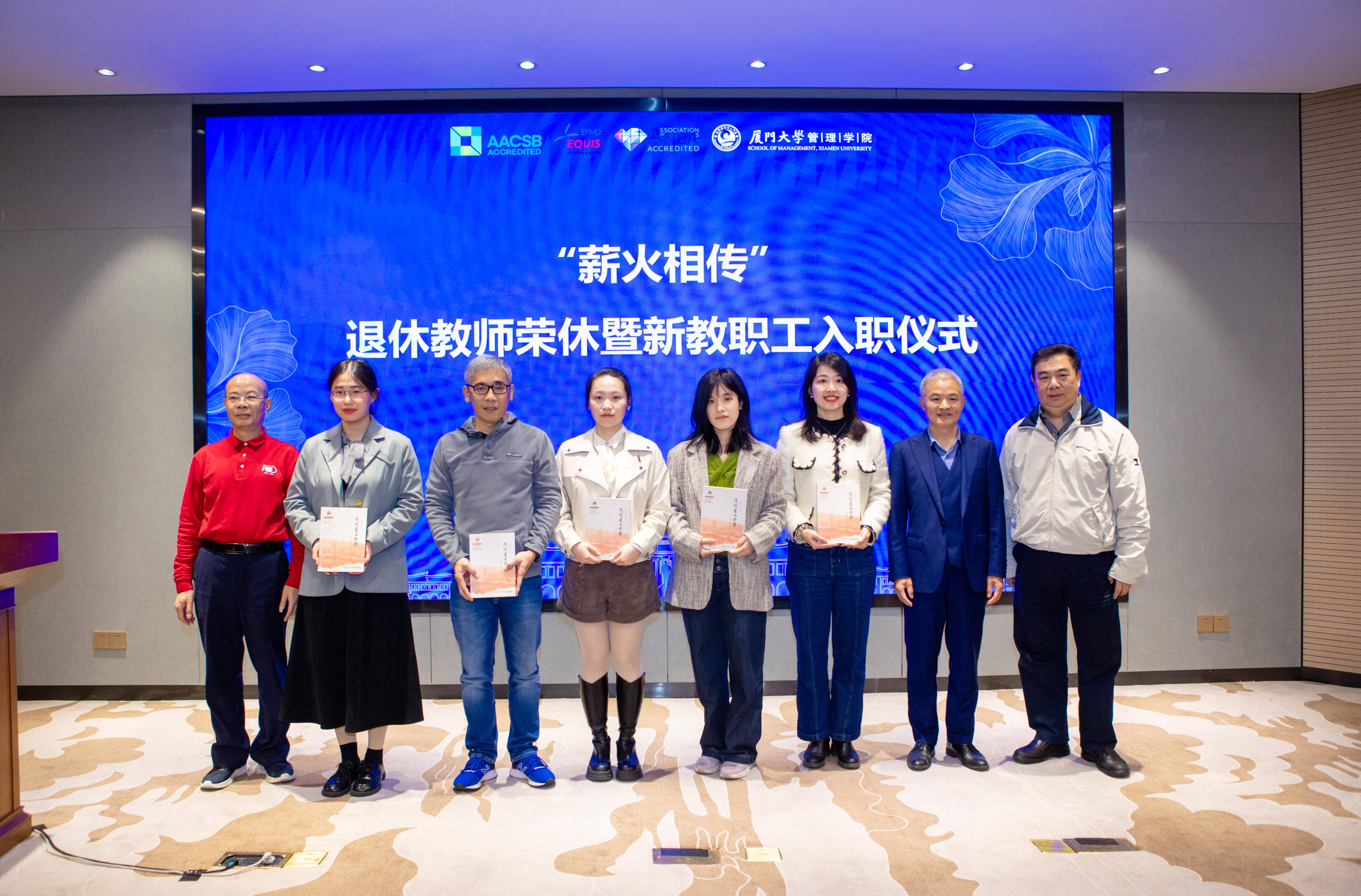 会议伊始,学院举行庄重而温馨的“薪火相传”退休教师荣休暨新教职工入职仪式。吴超鹏向2024年退休教师苏新龙、程文文、朱平辉颁授荣休纪念牌。
