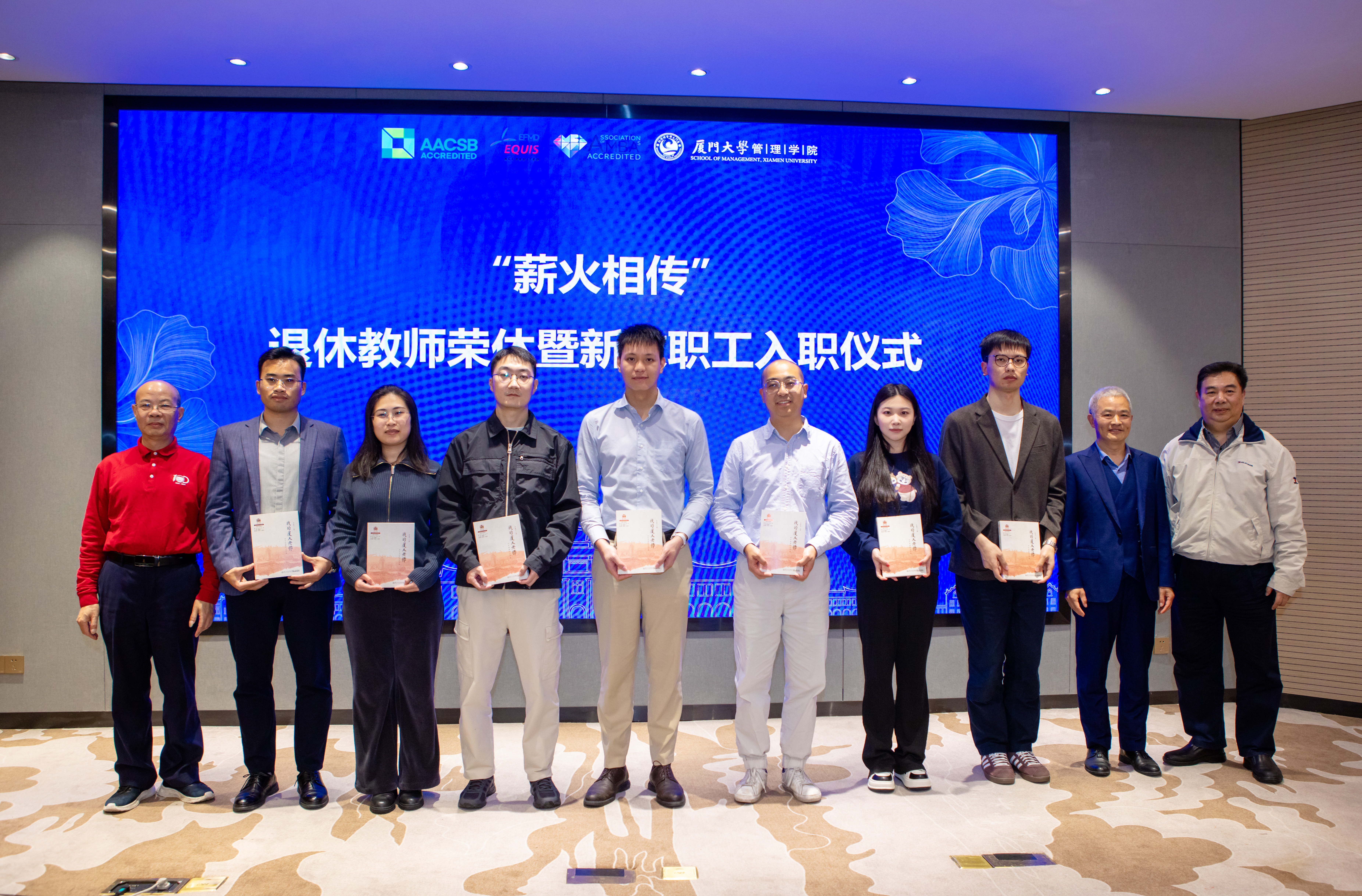 接下来,主持人向大家介绍2024年和2025年新入职的12名教职工,由退休教师代表向新教职工赠送书籍《我的厦大老师》,勉励他们能够从中汲取力量,落实立德树人根本任务,努力成长为教书育人的大先生。