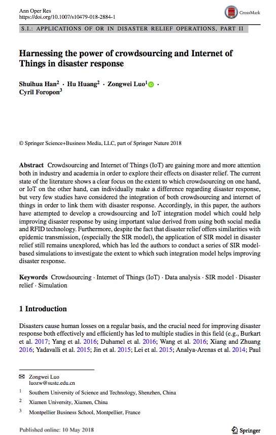 我院2016级硕士研究生黄虎、导师管理科学系韩水华教授与南方科技大学骆宗纬教授和蒙彼利埃商学院Cyril Foropon教授合作撰写的论文“Harnessing the Power of Crowdsourcing and Internet of Things in Disaster Response”于2018年5月10日发表在国际B类期刊《Annals Of Operation Research》上。