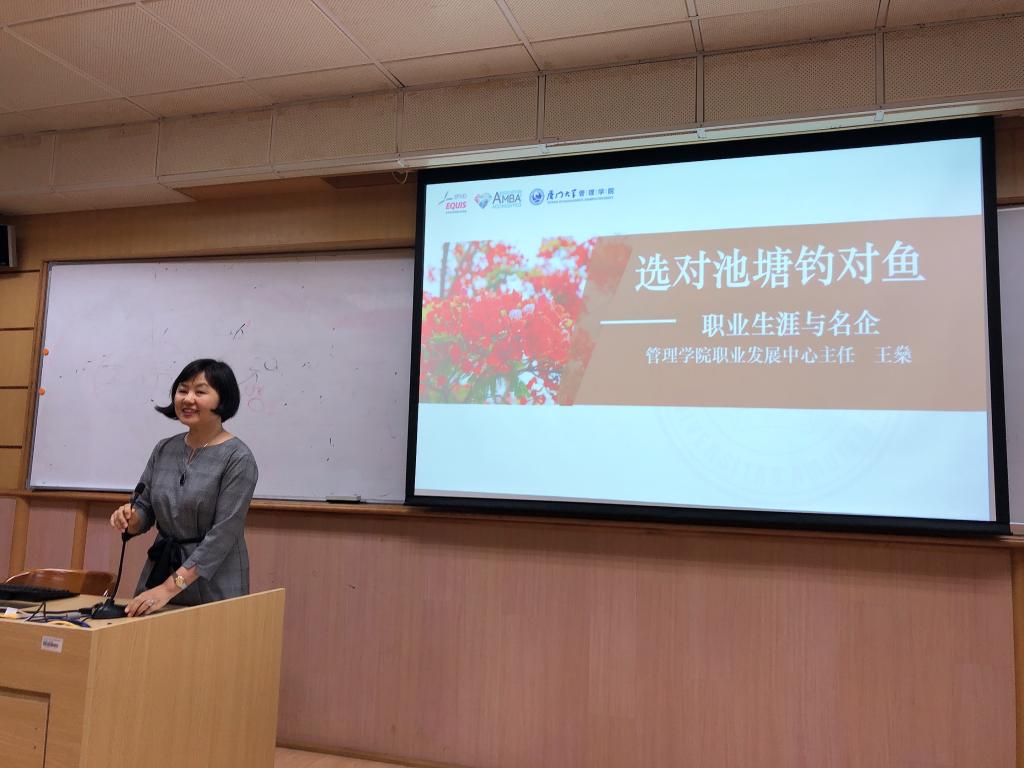 校友与对外合作办公室副主任王燊老师则以一位具有丰富职场经历的专家视角,以与QQ音乐HR在厦面试的交流体会为引,引申出一流企业的一流人才应是规划出来的观点。她分享了自己对于金融科技与互联网行业的见解和积累的诸多往届学生的就业求职经验,干货满满,令同学们获益良多。