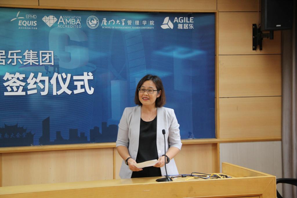 2019年7月10日下午,厦门大学管理学院&雅居乐集团未来π人才发展项目签约仪式在嘉庚二205室正式举行。厦门大学教育发展基金会副主任赵晓慧,管理学院党委书记邱七星、党委副书记洪秋霞、副院长吴超鹏,学院团委书记江娇、职业发展中心主任王燊、团委副书记吴荣梅、辅导员刘晓宇,雅居乐地产集团人力行政中心总经理兼雅居乐控股公司人力行政部副总经理张咏、雅居乐地产深圳区域总裁黄咏东,深圳区域福建事业部总经理叶伟斌,雅居乐地产人力行政中心行政管理部总监陈琼,深圳区域人力行政部总监姚洪伟以及众多优秀学生代表共同见证了本次签约仪式。签约仪式由洪秋霞主持。