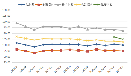 总体来看,相比于上季度,本季度各项指数呈下降趋势,总指数降到100点以下,且消费指数中的各项分指数均不足100点。对总指数起拉动作用的旅游指数、金融指数和健康指数及其各项分指数降幅也均在1%以上,虽然这三项指数仍处于高位景气区域,但依然需要关注和重视经济下行压力带来的各方面影响。今年上半年,受全球经济复苏放缓、中美贸易摩擦等负面形势影响,中国经济金融形势也较为严峻,但随着以“六稳”为代表的政策实施落地,经济运行中的稳定因素也在增多。展望下半年,尽管外部环境仍存诸多不确定性,但国内政策和市场环境均趋于好转,预计经济有望企稳。