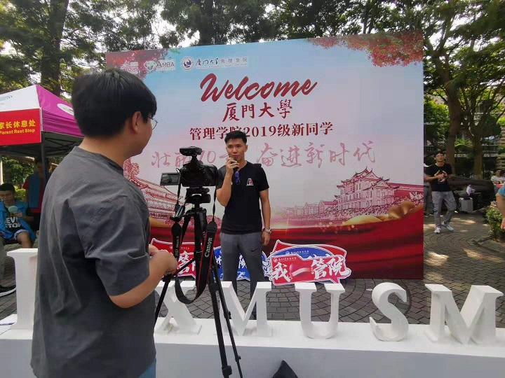 三脚架、摄像机,“壮丽七十年、奋斗新时代”主题展板,“青春告白祖国”、“我们都是追梦人”手举牌,“我爱厦大管院”立体浮雕——骄阳下管理学院2019年迎新特别策划《青春告白祖国》快闪录制正如火如荼地展开。