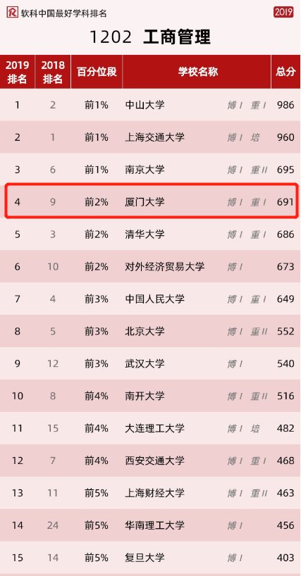 近日,2019软科中国最好学科排名正式发布,厦门大学工商管理学科在157所上榜高校中位列第4,系入围全国排名前2%的顶尖学科。