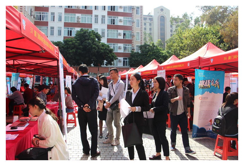 上午九点,招聘会正式开始。现场参加招聘会的同学络绎不绝,同学们手持简历、身着正装认真地与企业招聘管理人员交流,了解相关岗位信息。此次招聘会面向全校学生,旨在拓宽全校2020届毕业生的就业渠道,更好地为校友及其他用人单位和毕业生搭建双向选择的平台。招聘会特别邀请了澜海人力资源咨询有限公司总经理王澜、四三九九网络股份有限公司人力行政中心资深总监谢志勇就简历修改、行业选择、企业选择和职业发展等方面问题,在现场为同学们进行一对一指导。本次招聘会共有厦门象屿集团有限公司、卧龙控股、厦门国际银行等65家企业参加,涵盖了审计、财会、证券、银行、酒店、销售、咨询、物流、软件等各行业。岗位需求包括了财会、金融、人力、营销、旅游管理、物流、新闻广告、计算机软件和建筑等一千多个岗位。