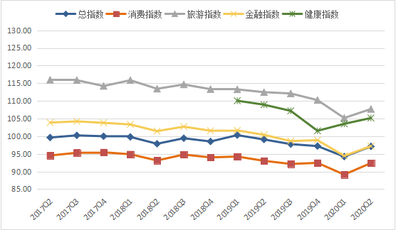 2020年第二季度海西地区金融、旅游、消费、健康信心总指数为97.09点,环比(较2020年第一季度,下同)上升2.87点,同比(较2019年第二季度,下同)下降1.98点。其中消费指数92.39点,环比上升3.27点,同比下降0.63点;旅游指数107.70点,环比上升2.55点,同比下降4.40点;金融指数97.18点,环比上升2.75点,同比下降3.20点;健康指数105.15点,环比上升1.65点,同比下降3.77点。
