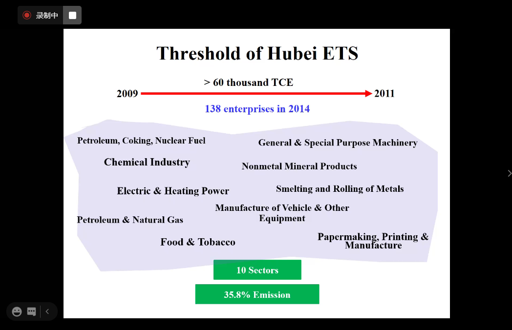 刘宇教授首先生动地介绍了湖北碳交易市场的特征及发展历程,并结合自身对于四个碳交易市场进行专业评估的经验,基于经济学理论阐释不同配额分配机制下的碳交易市场开展对于宏观经济的潜在影响。