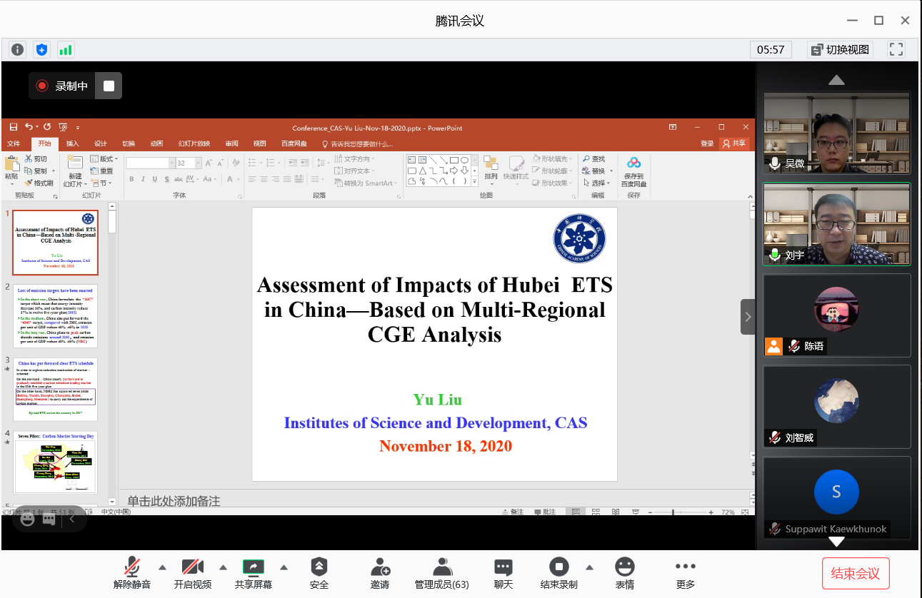2020年11月18日上午9:00,中国科学院科技战略研究院刘宇教授做客厦门大学管理学院中国能源政策研究院“能源环境经济与管理学术名家讲坛”,带来了题为“湖北碳交易市场的经济与环境影响模拟—基于多区域CGE模型”的线上报告。刘教授基于自主构建的多区域CGE模型,解读了湖北碳交易市场开展以来的经济与环境影响,吸引了众多管理学院师生聆听。讲座由中国能源政策研究院助理教授吴微主持。
