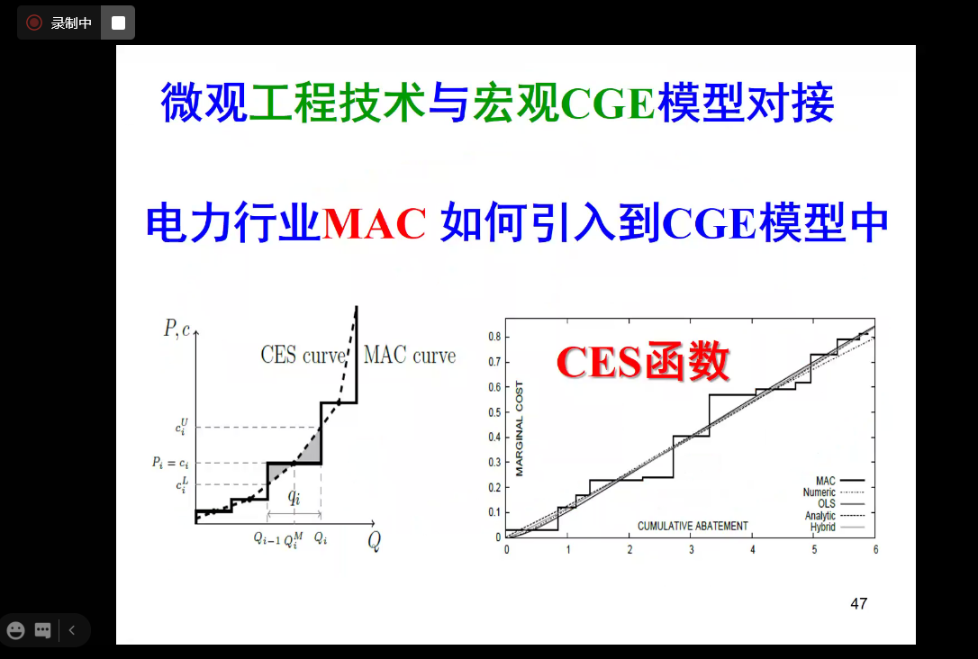 随后,刘宇教授深入浅出地介绍了团队使用的CASISD-R(多区域动态可计算一般均衡模型)的构建和模型细节,讨论了微观工程技术与宏观CGE模型对接的实现思路,并以电力行业为例,介绍了如何将电力行业的边际减排成本曲线嵌入到CGE模型中。