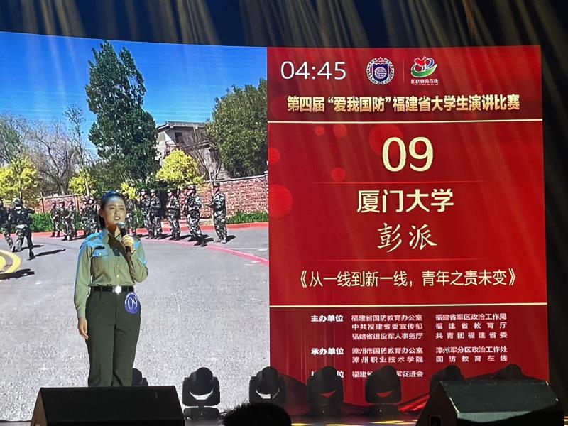 掌声与泪水交织,感动与震撼相汇。11月24日上午,福建省第四届“爱我国防”大学生主题演讲比赛决赛在漳州举行,来自全省各大高校的十四组学生代表在这里展开激烈角逐,厦门大学荣获优秀组织奖,管理学院旅游与酒店管理系2019级本科生彭派继市赛之后再次勇夺一等奖(第一名)!
