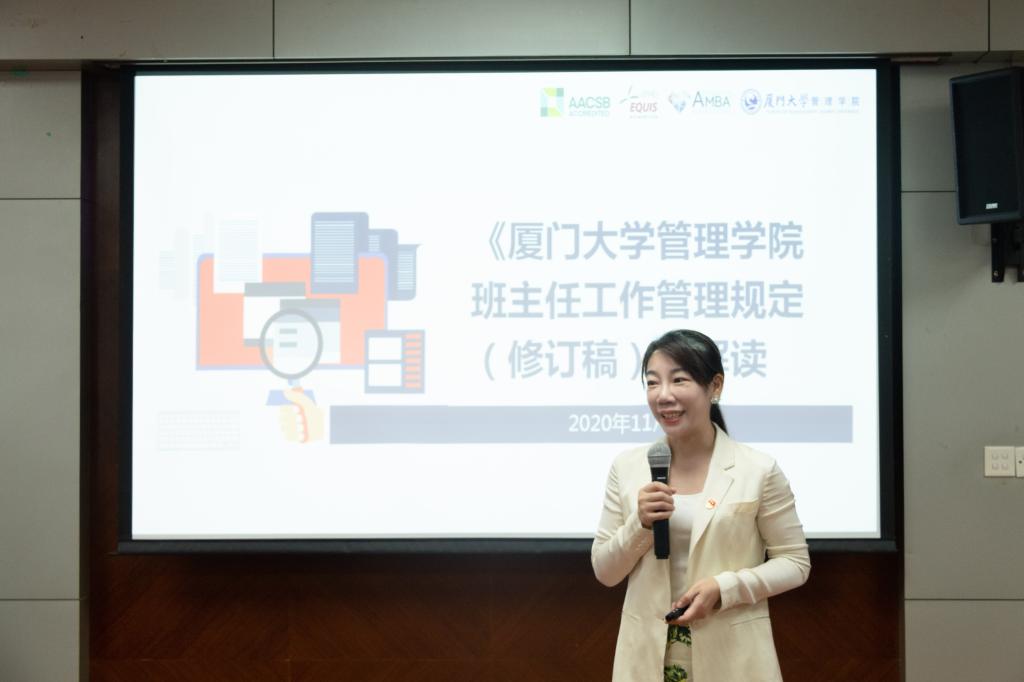 洪秋霞向全体参会人员介绍了《厦门大学管理学院班主任工作管理规定(修订稿)》、《厦门大学研究生导师行为准则》。她从总则规定、工作职责、配备选任、管理考核、培养发展等多方面对政策规定加以解读,明确传达了学校、学院对班主任与研究生导师队伍的培养、管理和考核准则,为引导班主任与研究生导师树立正确的师德师风思想,明确任职期间的权利与义务,营造良好的师生氛围指明了方向。