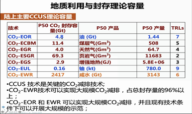 魏宁教授首先生动介绍了CCUS技术的发展历程和成本现状,并结合自身对于CCUS项目进行专业评估的经验,表明中国陆上CCUS技术的理论封存容量高达2.5T吨,CO2-EWR和CO2-EOR技术成熟度较高,可以实现大规模封存。