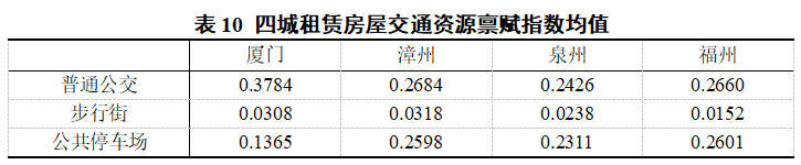 交通资源禀赋指数共分为五个部分:普通公交、快速公交、地铁、步行街和公共停车场。分别从普通公共交通、快速公共交通、道路易拥堵程度及私家车出行便捷程度四个方面考量了交通的整体资源分布特征,有助于为城市交通规划提出丰富内涵的意见与建议。由于该领域的二级指数较多,因此此处仅以普通公交、步行街和公共停车场为例,四城均值如表10所示,快速公交和地铁资源禀赋指数与普通公交的特征类似,在此不再赘述。