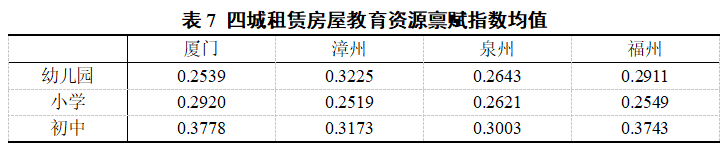 教育资源禀赋指数主要由幼儿园、小学和初中三个二级指数构成,四城均值如表7所示。由于当前购房的核心人群中有相当一部分人的参考是房屋的教育资源禀赋,因此,从此项中可以较好地发掘“租售同权”的可行性。