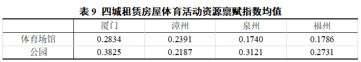 体育活动资源禀赋指数的目标是通过评价小区周边体育场馆与公园两个不同需求等级的体育活动设施的距离和数量的综合水平,以期得到体育活动资源禀赋的客观评价,四城均值如表9所示。