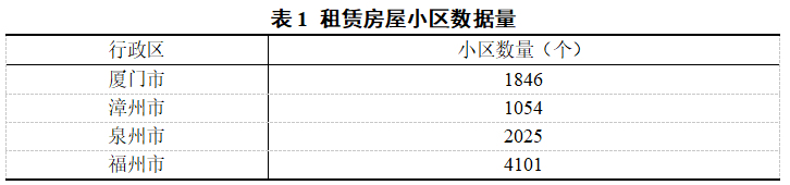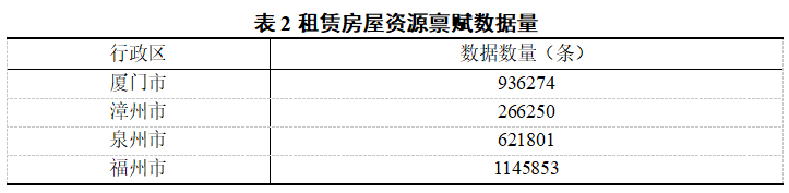 如表1所示,本报告使用的数据主要包括四座城市:厦门市、漳州市、泉州市与福州市的小区详情数据和小区周边资源禀赋情况。经过多方对比和估价师确定最终选择云评众联数据库中2020年1月到10月的小区详情数据。