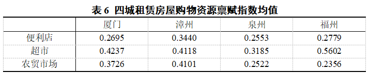购物资源禀赋由便利店、超市和农贸市场三个部分组成,反映三个等级购物场所以数量和距离综合表示的资源丰富程度,四城均值如表6所示。