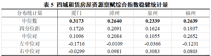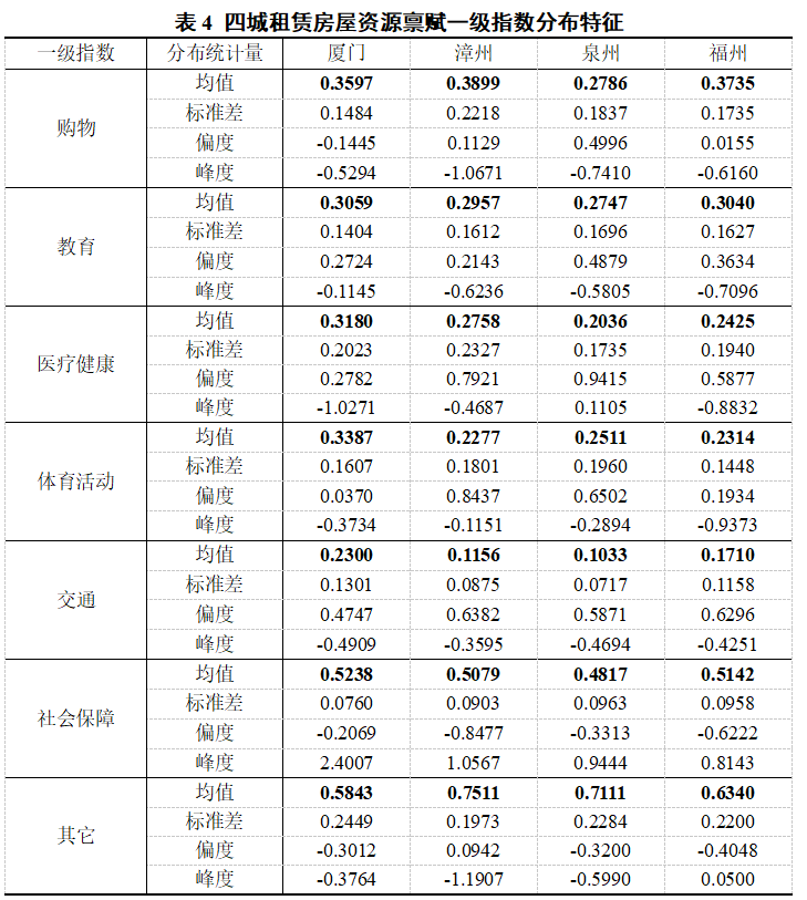 表4计算了四座城市租赁房屋资源禀赋一级指数的四个分布统计量,包括均值、标准差、偏度与峰度。分别从一级指数的平均水平、离散程度、极端值特征以及集聚程度四个不同的角度描述了一级指数的分布特征。