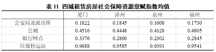 社会保障资源禀赋简单地划分为四个部分:银行网点、公安局及派出所、垃圾转运站以及公厕,四城均值如表11所示。同样从正负两个方向评价了资源禀赋中保障社会基本公共秩序必要的内容。