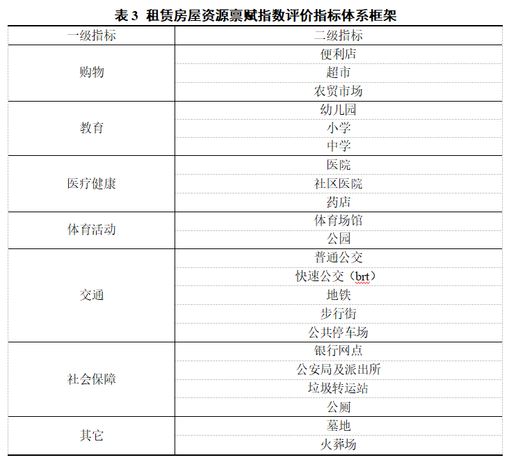 本次研究切实结合当前网络舆情、市场现状、民生民愿,通过深入调查,根据租赁房屋的空间分布特征和实际情况,在经验性标准和统计学方法的基础上,构建了“租赁房屋资源禀赋评价指标体系”。借鉴国内外“生活圈”相关研究理论和《城市居住区规划设计标准》等规范性标准,力求系统全面、客观有层次地反映四座城市租赁房屋生活圈理想程度。该评价体系由二级指标构成,详见表3。