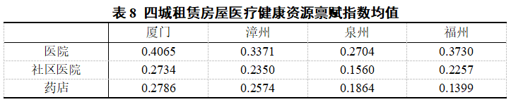 医疗健康资源禀赋指数由医院、社区医院和药店三个部分组成,四城均值如表8所示。对不同等级医疗健康资源的评价有利于整合医疗的进一步深化。
