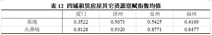 除了以上提到的资源禀赋以外,还存在另外一些对租赁房屋居住者有着较强烈影响的资源点,此处选取专家认为影响最为强烈的两个相似的资源点作为代表,即墓地与火葬场,四城均值如表12所示。墓地与火葬场均为负向指标,且在城市中的分布一般均极为紧密,对小区的影响也极为类似。